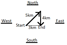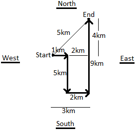 5. A man walks 1 km towards East and then he turns to South and walks 5 km.Again he turns to East and walks 2 km, after this he turns to North and walks 9 km. Now, how far is he from his starting point?