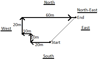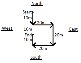 4. I am facing South.I turn right and walk 20 m. Then I turn right again and walk 10 m. Then I turn left and walk 10 m and then turning right walk 20 m.Then, I turn right again and walks 60 m.In which direction am I from the starting point?