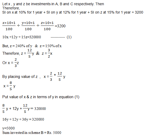 1. David invested certain amount in three different schemes A, B and C with the rate of interest 10% p.a., 12% p.a. and 15% p.a. respectively. If the total interest accrued in one year was Rs. 3200 and the amount invested in Scheme C was 150% of the amount invested in Scheme A and 240% of the amount invested in Scheme B, what was the amount invested in Scheme B?