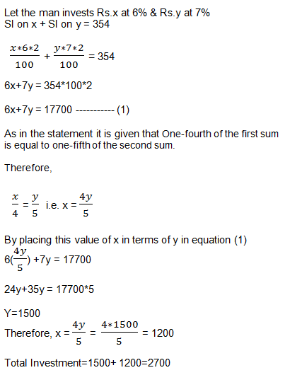 4. A man invests a certain sum of money at 6% per annum simple interest and another sum at 7% per annum simple interest. His income from interest after 2 years was Rs. 354. One-forth of the first sum is equal to one-fifth of the second sum. The total sum invested was :