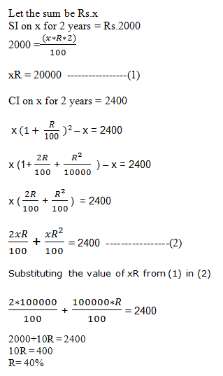 2. Arun borrowed a certain sum from Manish at a certain rate of simple interest for 2 years. He lent this sum to Sunil at the same rate of interest compounded annually for the same period. At the end of two years, he received Rs. 2400 as compound interest but paid Rs. 2000 only as simple interest. Find the rate of interest.