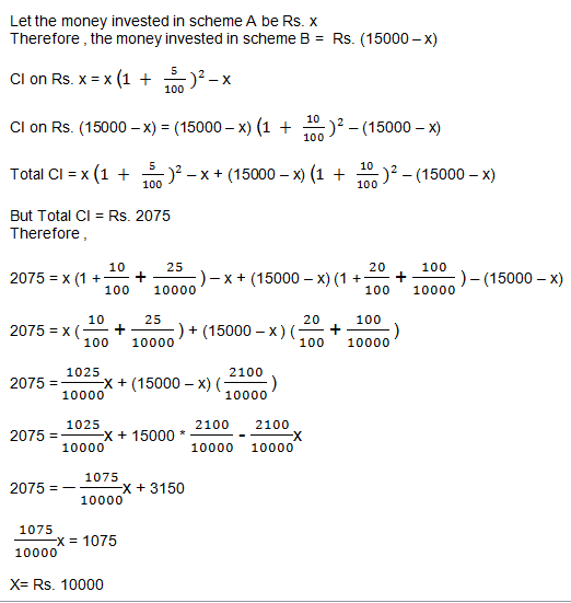 4. John invested money in two schemes A and B offering compound interest @ 5 p.c.p.a. and 10 p.c.p.a. respectively. If the total amount of interest accrued through two schemes together in two years was Rs. 2075 and the total amount invested was Rs. 15,000, find out the amount invested in Scheme A?