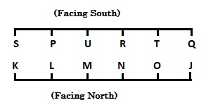 12 friends are sitting in 2 parallel rows containing 6 persons each, in such a way that there is an equal distance between the adjacent persons. In row 1 – P, Q, R, S, T and U and all of them are facing south. In row 2 – J, K, L, M, N and O are facing North.