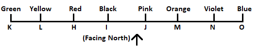 Eight friends H, I, J, K, L, M, N and O are sitting in a row facing north. All of them like different colours – Red, Pink, Orange, Green, Yellow, Black, Violet and Blue.