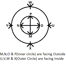 Eight friends M, N, O, P, U, V, W and X are sitting in two circles in such a manner that each member of the inner circle sits exactly opposite the member of the outer circle. The members sitting in the outer circle are U, V, W and X and all of them are facing towards the centre while the members of the inner circle are M, N, O and P and they are facing away from the centre. Each of them likes a different colour, viz Red, Yellow, Blue, Green, White, Black, Orange and Purple, but-not necessarily in the same order.