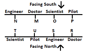 Eight people R,S,T, U, M, N,O and P are sitting in 2 parallel rows containing four people each. R, S, T and U are sitting in row 1 facing north and M, N,O and P are sitting in row 2 facing south but not necessarily in the same order. Thus each persons in row 1 faces another person sitting in row 2. Each of the two rows consists of one Doctor, one Engineer , one Pilot and one Scientists.