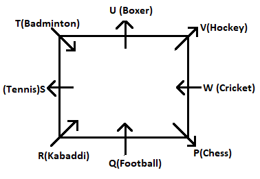 Eight players – P, Q, R, S, T, U, V and W sit around a square table in such a way that four of them sit on the four sides while the rest at corners. They play different sports like Chess, Football, Kabaddi, Tennis, Badminton, Boxing, Hockey and Cricket. Some of them are facing the centre while some are facing facing outside.(i.e away from the centre)
