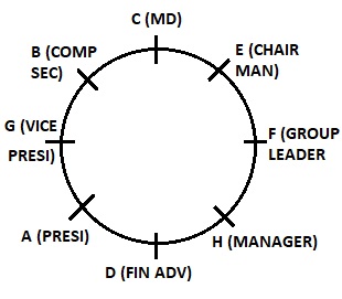 - F is not an immediate neighbour of A. G is not an immediate neighbour of the Manager. Only two people sit between the Managing Director and H. The Vice – President and the Company Secretary are immediate neighbours of each other.
