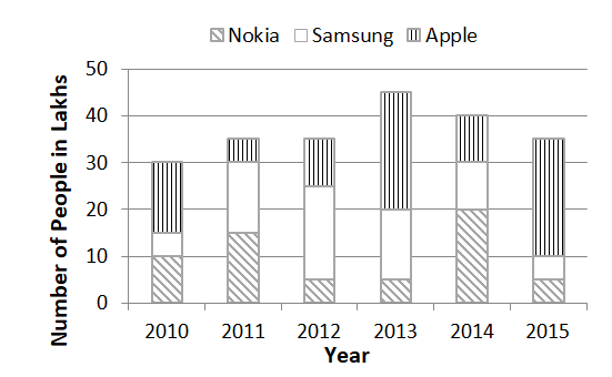 Number of people (in lakh) using three different brands of mobile phones over the years.