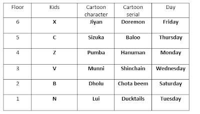 Six kids– Z, X, C, V, B and N- watch in different Cartoon serials on their TV viz. Ducktails, Doremon, Shinchain, Baloo, Chota beem and Hanuman – and they are lives on six different floors of a building, numbered 1 to 6. They like six different Cartoon Characters viz. Dholu, Sizuka, Munni, Lui, Jiyan and Pumba, in no particular order. Each Cartoon serial is cast on a different day from Monday to Saturday. X likes Jiyan and Cartoon serial likes by him is Doremon and lives on the 6th floor of the building. B and Z lives on even numbered floors who’s cartoon cast on Saturday and Monday. The one who watch Ducktails is lives on the lowest floor and it is cast on Tuesday. Baloo Cartoon serial watch by that kid who lives on the floor next to X and it is cast on Thursday. The kid who watches Hanuman likes Pumba and his cartoon is cast on Monday. N likes Lui and he lives on first floor. One of the kid who watches Cartoon serials which cast on friday lives on even numbered floors. V lives two floors below C and he likes Munni. B, who does not live immediately above or below of C, likes Dholu and his serial cast on Saturday. The kid who likes Chota beem is lives on an even numbered floor.