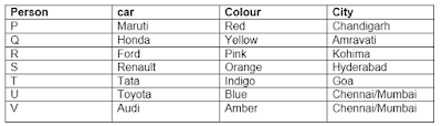 There are seven friends named P, Q, R, S, T, U and V from different cities Mumbai, Chennai, Amravati, Hyderabad, Kohima, Goa and Chandigarh but not necessarily in the same order. They all have different car viz. Maruti, Audi, Honda, Tata, Toyota, Renault and Ford but not necessarily in the same order. They all like different colours like Orange, Red, Yellow, Blue, Amber, Indigo, and Pink but not necessarily in the same order .