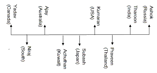 Nine persons Subash, Kumaran, Tharoon, Ajay, Yadav, Praveen, Achuthan, Niraj and Ashok are sitting in a row facing in either north or south direction but not necessarily in the same order. They work in different countries they are Australia, India, Russia, USA, Japan, Kuwait, Canada, Thailand and UK but not necessarily in this order. The following information is known about them.