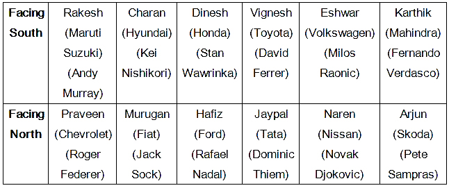Eshwar, whose favourite player is Milos Raonic sits third to the left of the person who likes Hyundai and not sitting at the extreme ends, Vignesh, who likes Toyota, does not sit at an extreme end of the row. If Eshwar sits at an extreme end then Vignesh doesn’t sit to the immediate right of the one who likes Hyundai. Naren and Hafiz face the persons whose favourite players are Milos Raonic and Stan Wawrinka respectively. There are two persons sitting on the right side of Jaypal, who sits second to the right of the person, whose favourite player is Jack Sock. Jaypal, who likes Tata, faces the immediate neighbour of Dinesh. Dinesh likes Honda. Hafiz sits with the persons who like Tata and Fiat. Karthik faces the person who likes Skoda car and Pete Sampras player but Karthik does not like Hyundai. The one who likes Fiat car doesn’t sit with the one who likes Skoda car. The person, who likes Nissan car, sits second to the right of the person who likes Ford. Praveen does not like Skoda and faces the person, who likes Maruti Suzuki. The person who likes Fernando Verdasco is an immediate neighbour of the person who likes Volkswagen. Rakesh’s favourite player is Andy Murray and he doesn’t sit with Dinesh. Naren does not like Rafael Nadal player. The person, whose favourite player is Roger Federer, faces the person, who sits second to the right of the person, whose favourite player is Stan Wawrinka. The person whose favourite player is David Ferrer does not sit in row 2 and faces the person who likes Dominic Thiem. Murugan faces the person who likes Kei Nishikori. Rakesh doesn’t face the person who likes Ford car. The one who likes Chevrolet sits in Row 2.