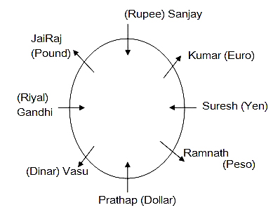 Sanjay, Vasu, Gandhi, Jairaj, Prathap, Kumar, Suresh and Ramnath are eight friends sitting around a circular table. Four of them are facing towards the centre and four of them are facing away from the centre. All of them like different Currencies, viz. Dollar, Pound, Dinar, Peso, Euro, Rupee, Yen and Riyal, but not necessarily in the same order. Prathap faces towards the centre and likes Dollar. Both the immediate neighbours of Prathap face away from the centre and like Dinar or Peso. Jairaj faces away from the centre. Both the immediate neighbours of Jairaj do not face away from the centre. Prathap sits third to the right of Kumar, who likes Euro and faces away from the centre. Gandhi sits third to the left of Kumar. The one who likes Dinar sits opposite of Kumar. The one who likes Pound is not the immediate neighbour of Kumar and faces away from the centre. Sanjay sits second to the left of Gandhi and does not like Yen or Riyal. The one who likes Yen sits between Ramnath and Kumar. Vasu faces away from the centre and does not like Pound.