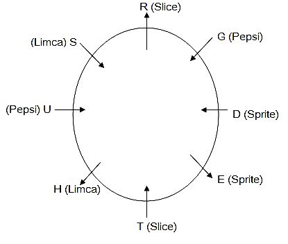 T sits on the immediate right of E, who likes Sprite. G sits third to the left of U, who likes Pepsi and both are facing the same direction. G and E are not facing the same direction but G is an immediate neighbour of R. R sits fourth to the left of T and both are facing opposite directions but like the same soft drink. The persons who like Sprite sit adjacent to each other, but face opposite directions. The persons who like Slice sit opposite each other. The immediate neighbours of R are facing the centre. The person who likes Pepsi is an immediate neighbour of the persons who like Limca. H and S are immediate neighbours of U. H is not facing the centre and likes Limca. The one who is on the immediate left of S is not facing the centre. S sits second to the right of G.