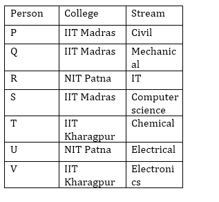 There are seven friends namely P,Q,R,S,T,U and V, who are doing engineering in different streams i.e mechanical, electrical, chemical, electronics , IT, computer science and civil but not necessarily in the same order. All of them studies in three different colleges i.e IIT madras, NIT Patna, IIT Kharagpur. At least two friends study in each college.