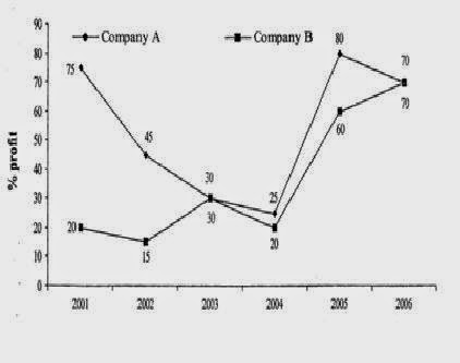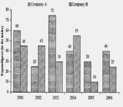 Directions (1-5): The expenditure and percentage profit of two companies A and B for six years in the period 2001-2006 are shown in the given bar graph and line graph. The expenditure is given in lakhs.