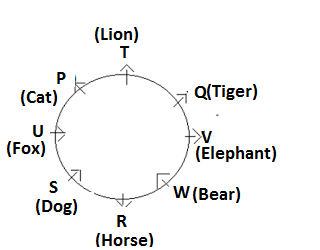P sits third to right of R. There is only one person sits between P and Q. S sits fourth to right of Q. P likes the cat . The one who likes bear sits second to right of S. The person who likes tiger sits second to the right of the person who likes cat. S does not like tiger . The person who likes horse sits third to right of the person who likes tiger . R likes horse. There are two persons sits between S and T. There are three persons sit between the person who likes fox and the one who likes elephant . T does not like fox and elephant . There is only one person sits between the person who likes elephant and the one who likes lion . The person who likes bear sits third to right of the person who likes lion. The person who likes dog sits third to right of the person who likes elephant . V sits fourth to right of the person who likes fox . U is not the immediate neighbour of V. The person who likes fox sits third to left of the person who like bear and both faces the same direction(Same direction means if one faces centre then other also faces the centre and vice-versa).T faces opposite to the centre.