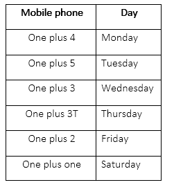 Six mobile phones namely—One plus one, One plus 2, One plus 3, One plus 3T, One plus 4 and One plus 5 are releasing during a period of Monday to Saturday, one mobile phone on each day. Monday is the starting day of the week. The mobile phone One plus 3 was released at least before three mobile phones. The mobile phone One plus 5 was sold on Tuesday. Both the mobile phones One plus 2 and One plus 4 were sold at least before one mobile phone. The mobile phone, One plus 3T was sold immediately after the mobile phone One plus 3. At least four mobile phones were sold after the mobile phone One plus 4.