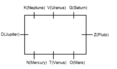 Eight aliens V, N, K, G, O, D, Z and T from different planets Neptune, Uranus, Saturn, Pluto, Venus, Jupiter, Mars and Mercury are sitting around a rectangular table facing towards the centre but not necessarily in same order. Each alien is facing another alien of opposite side. Only three are sitting on each longer side while one on each of the smaller sides. O is sitting second to the right of the alien who is from Mercury. G is sitting third to the left of the alien who is from Jupiter. The alien from Pluto is sitting third to the right of the alien from Mercury, who is not sitting diagonally opposite the alien from Uranus. The alien from Pluto is third to the left of K. D sits second to the left of T. The alien from Uranus sits opposite to the alien from Venus. D and Z are sitting opposite to each other. K is sitting diagonally opposite the alien who is from Mars. N is sitting opposite the alien who is from Neptune. The alien from Pluto is sitting second to the right of the alien from Venus and second to the left of V, who is not sitting near the alien who is from Mars. Z is sitting on the smaller side and to the immediate right of the alien who is from Mars. Aliens from Venus and Pluto are not on the same side of the table.
