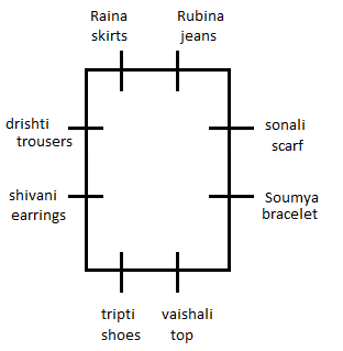 Drishti did not bought earrings or top. The one who bought top sits opposite to the one who bought jeans. Tripti sits 3rd left to Sonali, who bought scarf. Shivani did not buy top. Soumya bought bracelet. The one who bought scarf sits opposite to the one who bought trouser. The one who bought skirt and jeans sit on one side. Tripti did not bought skirt. Sonali sits on the longer side and Tripti on the shorter. Raina and Rubina sit on one side. Only Sonali sits between Rubina and the one who bought bracelet. The one who bought earrings sits on the longer side .No one sits between the ones who bought earrings and shoes.