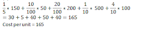 Q5. If a drink is prepared by mixing 1/5th of drink A, 10% of drink B, 20% of drink C, 1/10th of drink D and remaining drink E. What will be the cost of the drink prepared per unit?