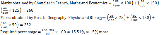 Q4. Marks obtained by Chandler in French, Maths and Economics together is what percent more/less than marks obtained by Ross in Geography, Physics and Biology? (approximate)