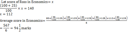 Q2. If score of Ross in Economics would have been 25% more, then it would be 140 marks. Find the average score of all the students in Economics.