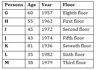 There are seven persons G, H, I, J, K, L and M who were born on the same day of the same month of different year i.e. 1974, 1936, 1957, 1962, 1972, 1979 and 1982 but not necessarily in the same order. Each of them lives on different floors of the same building having eight floors (the ground floor is numbered as the first floor while the topmost floor is numbered as the eighth floor). One of the floor is vacant