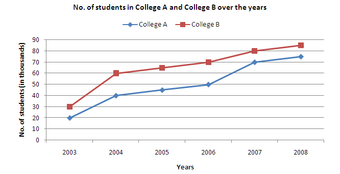 Q7. What is the ratio of the total number of students of College A in years 2004, 2006 and 2007 together and the total number of students of College B in years 2003, 2004 and 2008?