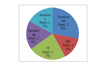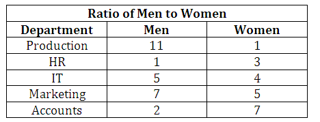 Percentage break up of employees working in various departments of an organisation and the ratio of men to women in them.