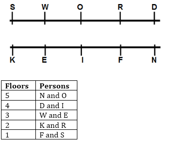 Ten persons are sitting in two parallel rows, facing each other. D, R, S, O, and W are facing south – while N, E, K, I and F are facing North. All of them lives in the same building having five floors, with the bottommost floor being numbered as 1 and topmost being numbered as 5. There are two people living on each floor of the building. K faces S. R, who is sitting to the immediate left of O, is facing F, who lives on the floor immediately below R. S, who lives on the same floor as F, sits on one of the extreme ends. W sits opposite to E and both live on the same floor. There is only one floor between N and E. S lives below K. F sits to the immediate left of N who faces D. N who lives on the topmost floor sits on one of the extreme ends. O and N lives on the same floor. K, who is an immediate neighbour of E lives on the same floor as R.