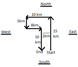 5. Johnson left for his office in his car.He drove 15 km towards the north and then 10 km towards west.He then turned to the south and covered 5 km.Further, He turned to the east and moved 8 km.Finally, He turned right and drove 10 km .How far and in which direction is he from his starting point?