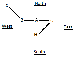 3. A is East of B and West of C, H is South-West of C and B is South-East of X, who is the farthest west?
