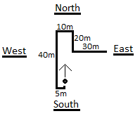 5. Anshul starts from his house towards West.After walking a distance of 30 m, he turned towards the right and walked 20 m. He, then turned left and moving a distance of 10 m, turned to his left again and walked40 m.He now turns to the left and walks 5 m. Finally he turns to his left. In which direction is he walking now?